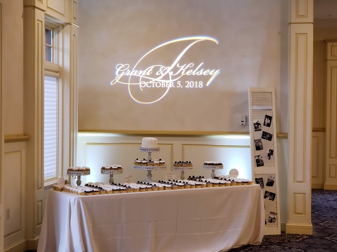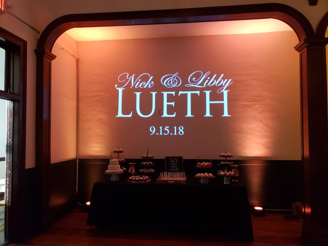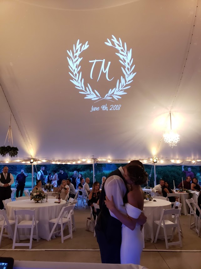 Personalize your wedding with a monogram light. We use a custom made glass gobo to create your names (or logo) in lights. We have several templates you can choose from, or you can send us your own design. Can be a static image or video monogram.